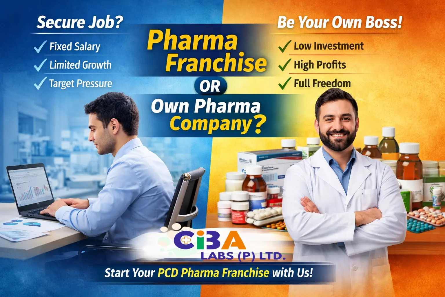 Choosing between a pharma job and your own business is a crucial decision. While jobs offer stability, a pharma franchise business with CIBA Labs offers freedom, growth, and financial independence.