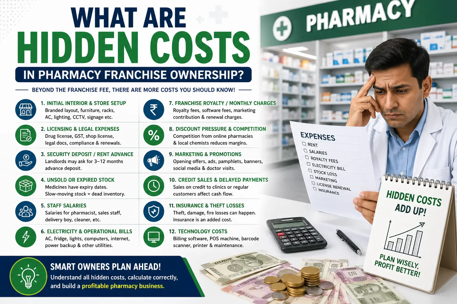 Starting a pharmacy franchise can look profitable on paper, but many new owners underestimate the hidden costs beyond the franchise fee and stock purchase. Knowing these in advance helps protect your investment.